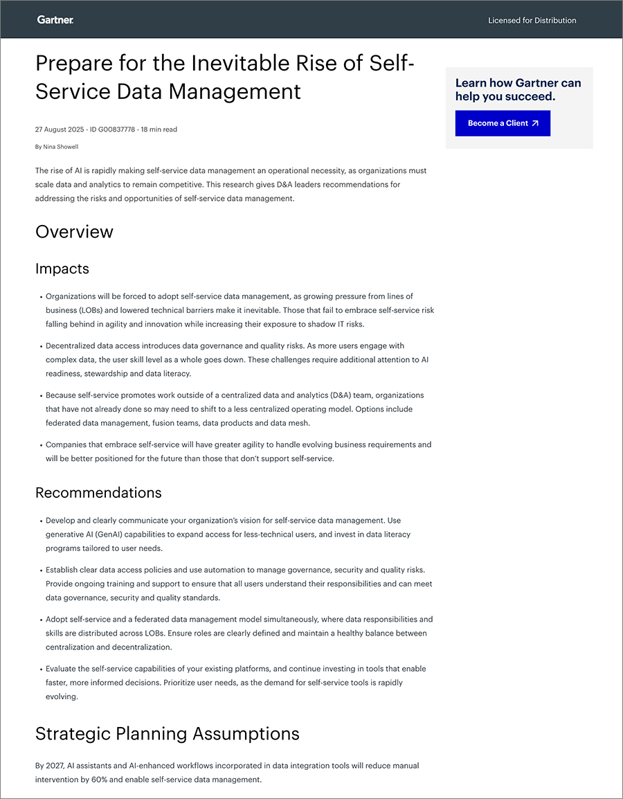 Gartner, Prepare for the Inevitable Rise of Self-Service Data Management, 27 August 2025, Nina Showell